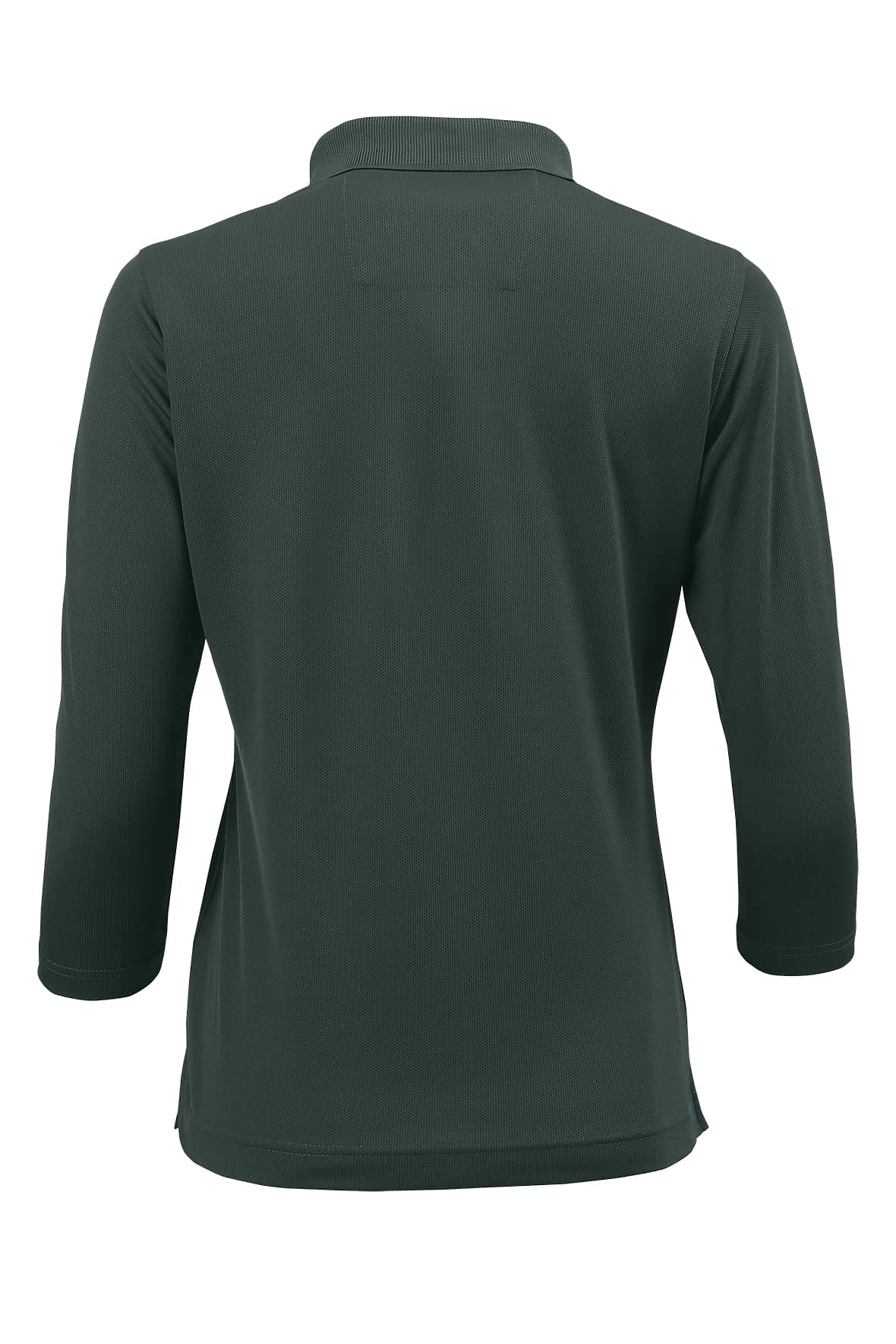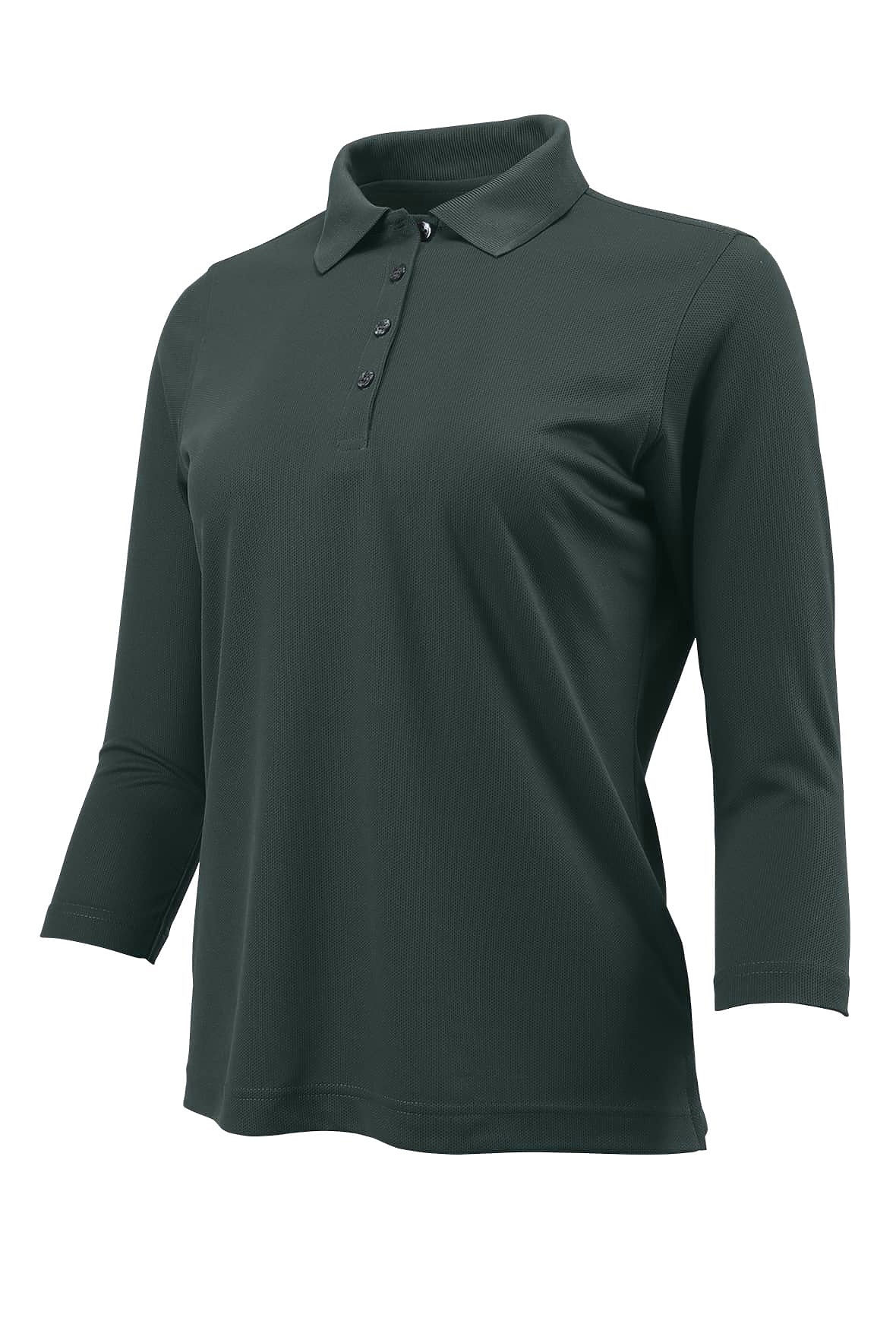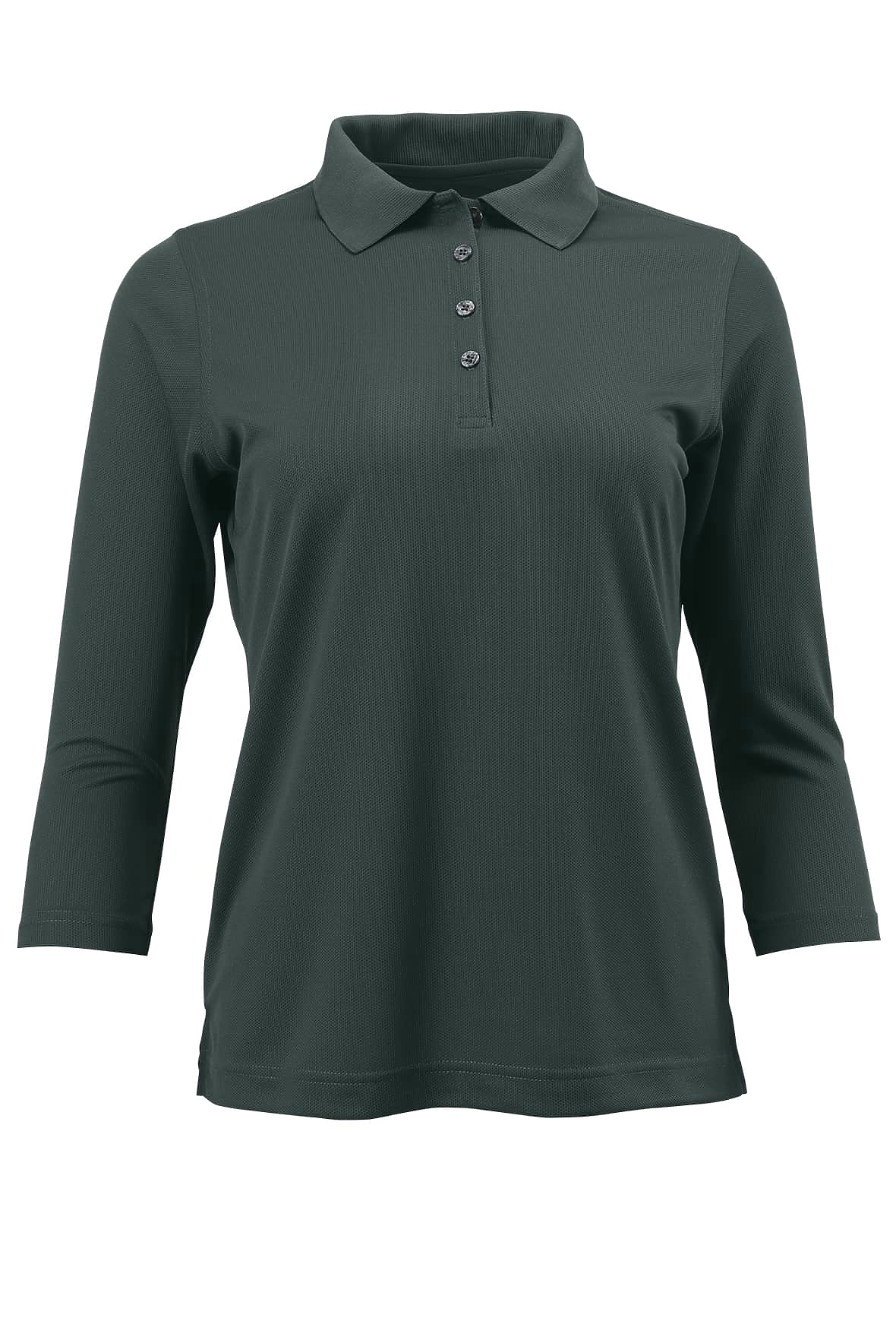 This flattering three-quarter length sleeve performance polo, will soon be a favorite. Four button clean finished placket. Detailed stitching two-needle hemmed sleeve and bottom. Side vents. 4.3 oz.